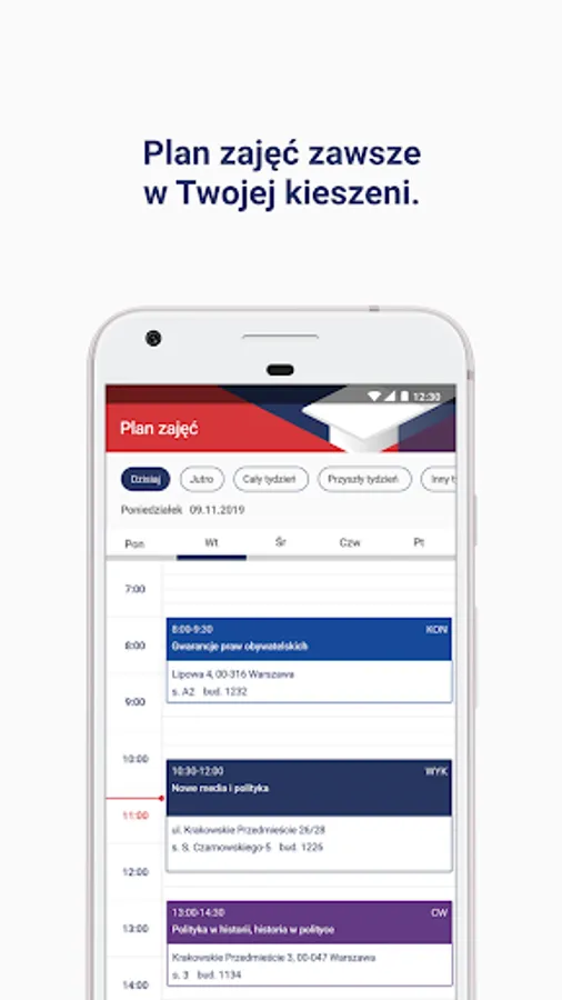 Class groups - information about the course, lecturers and participants are available; the location of classes can be viewed on Google maps, and the dates can be added to the calendar used on the mobile phone.