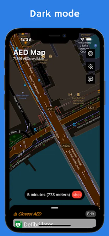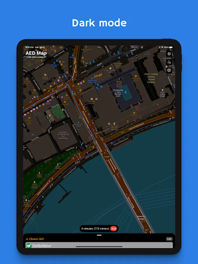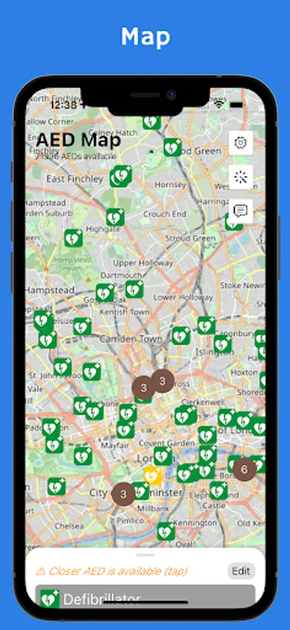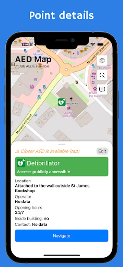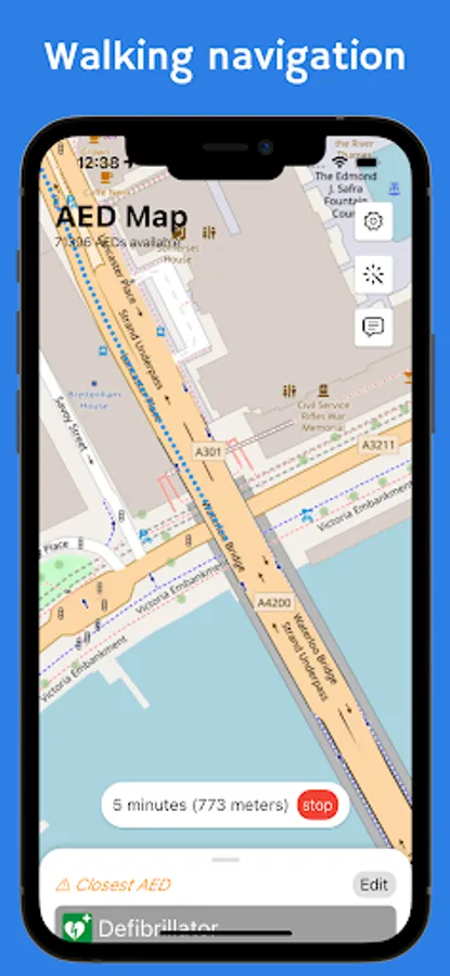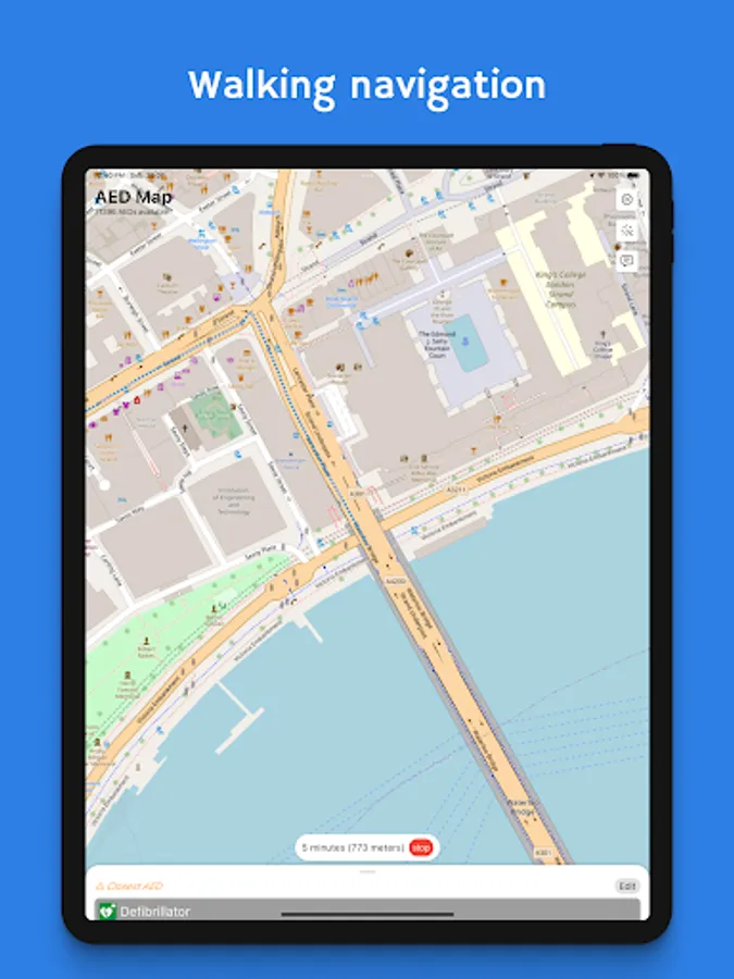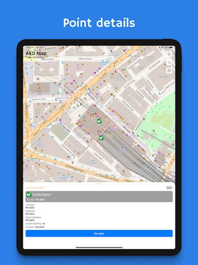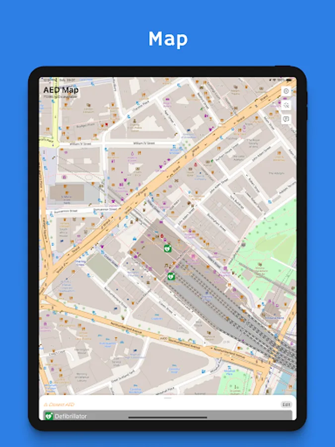 The application allows you to display available AEDs (automated external defibrillators) on a map.
