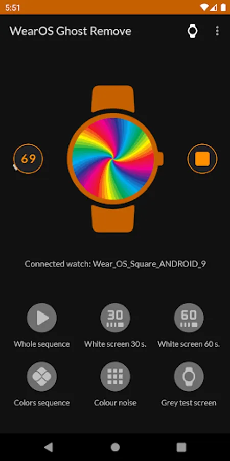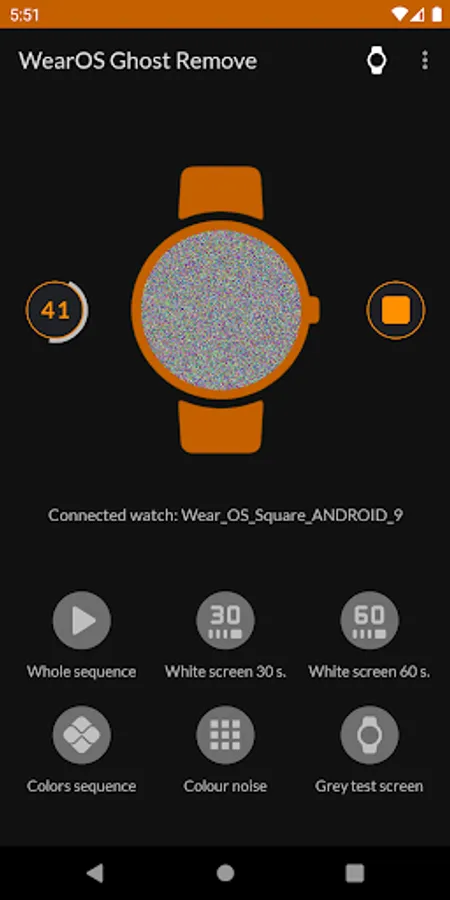 To remove afterimages (screen ghosts) from the LCD display, the app tries to increase the watch screen brightness to the maximum while playing correction sequences. The main correction sequence lasts 3 minutes and puts a heavy strain on your watch's battery. Use this app only when you don't need your watch and can plug it in to charge.