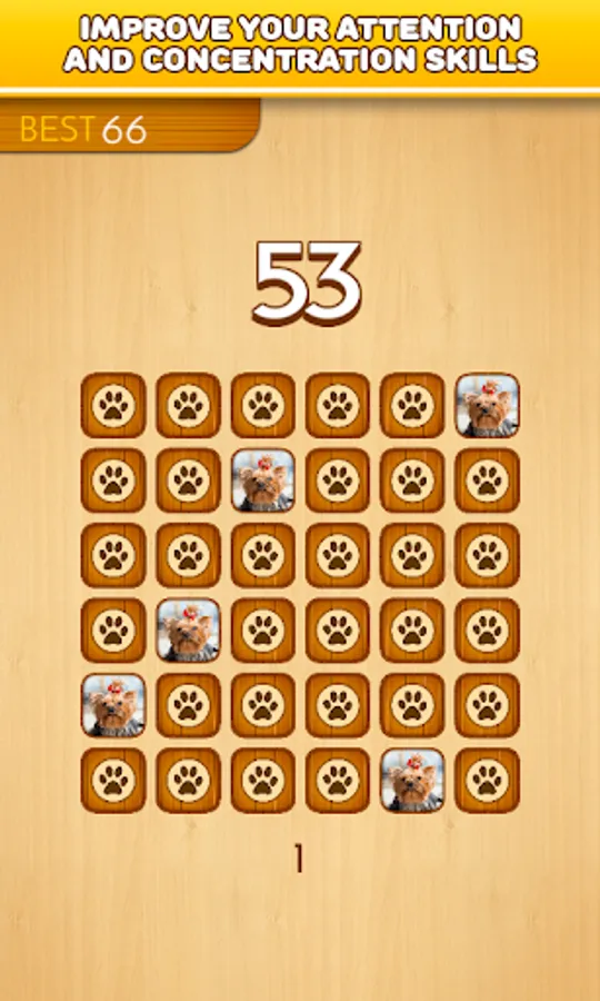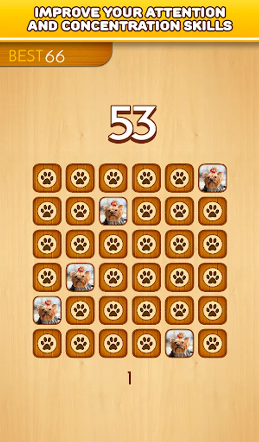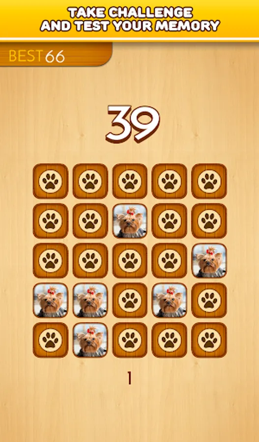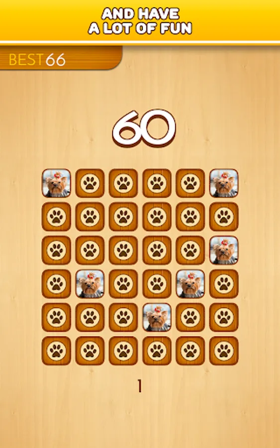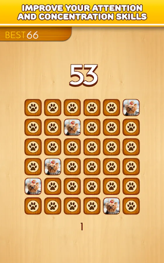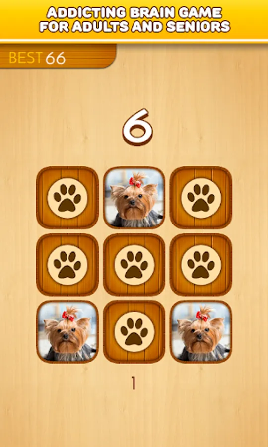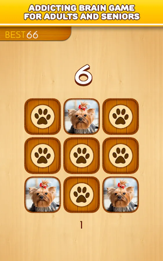 Can you memorize and recreate pattern of cards with cute puppy on 3x3 board? Can you do it on 4x4, 5x5 and 6x6 board? You have only one second to memorize a pattern. Looks simple? But is quite difficult. So, take a challenge and test your memory in this addicting brain teaser!