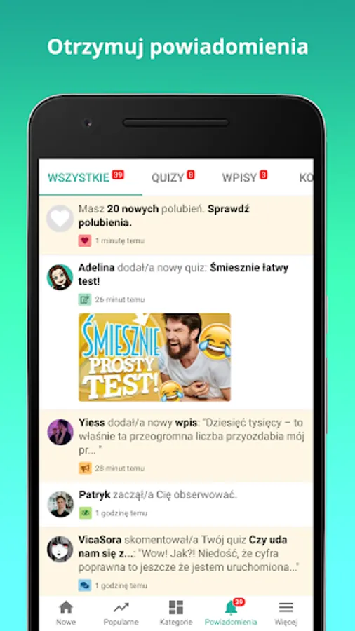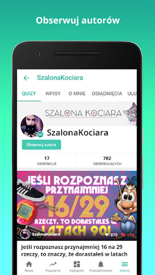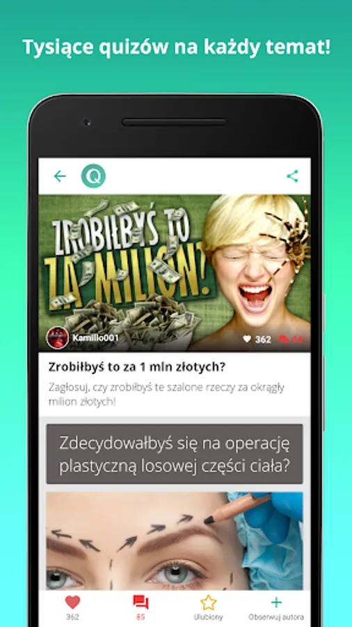 In the application you will find over half a million personality quizzes, created by the largest quiz community in Poland. Every day, our users publish several hundred new quizzes, and the best ones are promoted on the home page.
