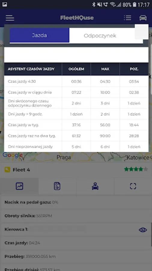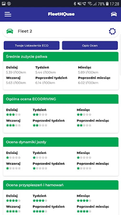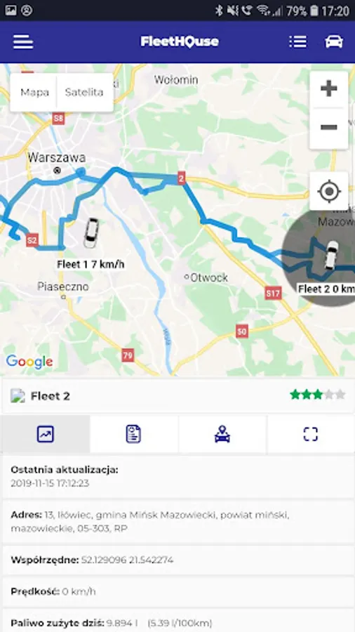 The FleetHouse application offers its users constant access to information about its fleet, its location and the routes traveled. Available filtering allows you to narrow the list of displayed information to selected groups of vehicles, while Google maps guarantee reliability and speed in correctly locating the fleet and drivers enabling users to plan any routes.