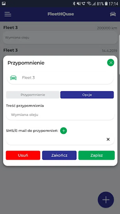 REMINDERS will generate sms / e-mail notifications about upcoming maintenance, tire replacement or termination of current insurance policies.