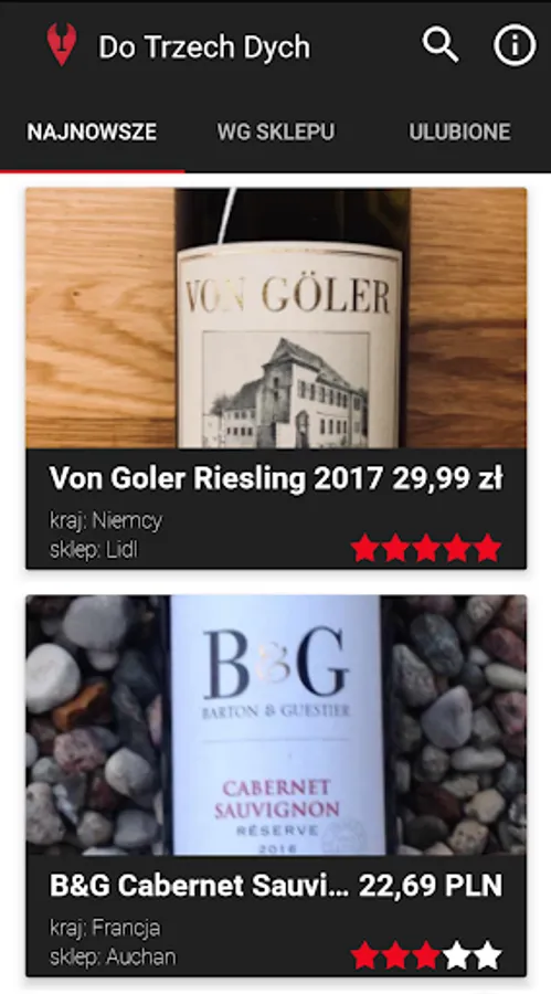 This is the first such application in Poland fully adapted to the local market. Here you can find reviews of wines currently offered by stores, supermarkets and discount stores (including Żabka, Biedronka, Tesco, Carrefour, Auchan, Lidl, Netto and many others). The application constantly updates the database of reviews, so you'll always be searching among the most current wine list! All reviews come from dotrzechdych.pl. They are independent, short, informative - useful! We recommend the best wines at the best prices!