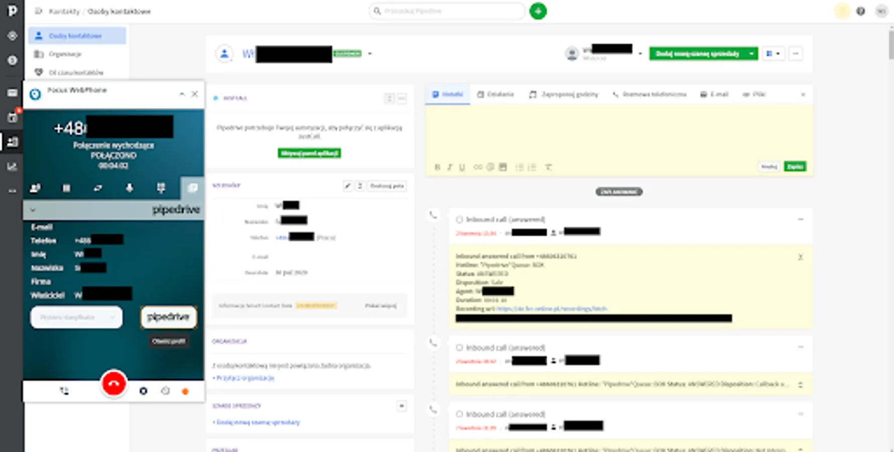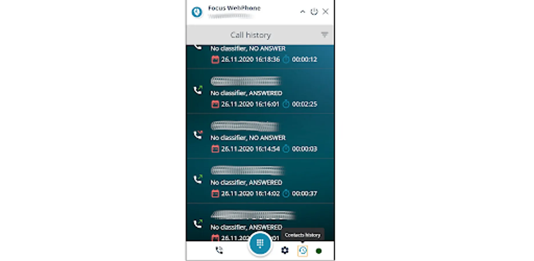 and recording VoIP calls using agents' mobile phones. This application includes all the functions that are available in the standard version of WebPhone, i.e. handling calls within and outside the campaign, access to the list of contacts and the list of missed calls and the history of contacts. All calls made using WebPhone Mobile are recorded and saved in reports. It is also possible to use the application in integration with external CRM systems.