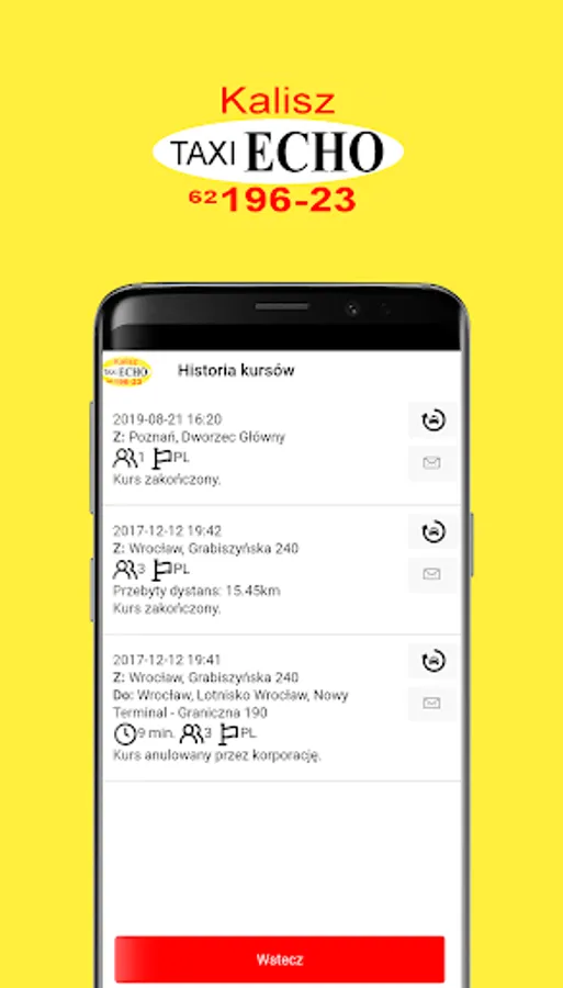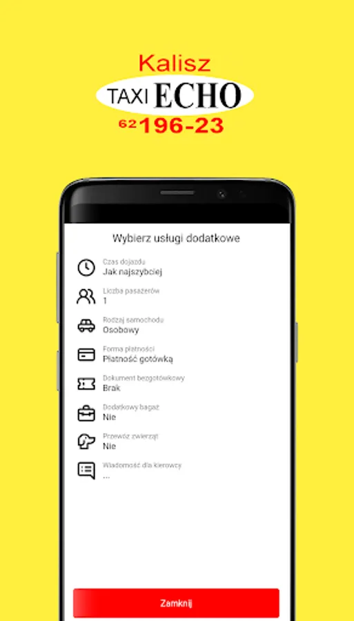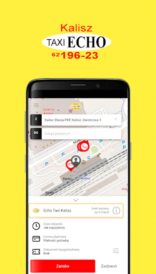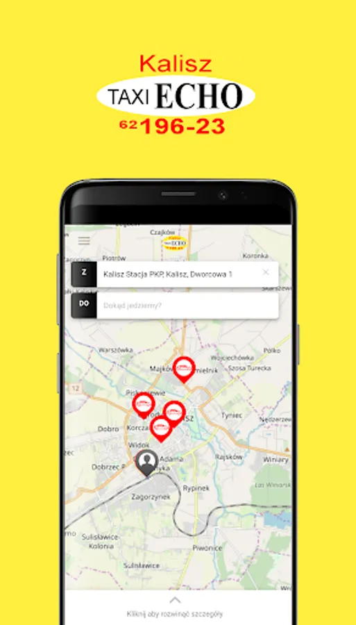 The application for convenient order Echo Taxi in Kalisz. With this application quickly and efficiently you order online and you will have control of the taxi, which goes to you. You will be able to observe the driver and see how much more expensive it is to drive. TAXI Echo application in several languages making it easier to order a taxi to foreign customers. With Echo Taxi Kalisz safely you get to your destination. Experience Echo Taxi drivers allow you to quickly and safely reach the destination of your trip. Echo Taxi Corporation has 30 years of experience in Kalisz market. Our car did not disappoint. TWU corporation in Kalisz Echo provides services for private clients and for companies with whom we tie up contracts for the carriage of passengers and goods. We also provide other services related to passing that we set previously with customers. Taxi Echo invites you to use our services.