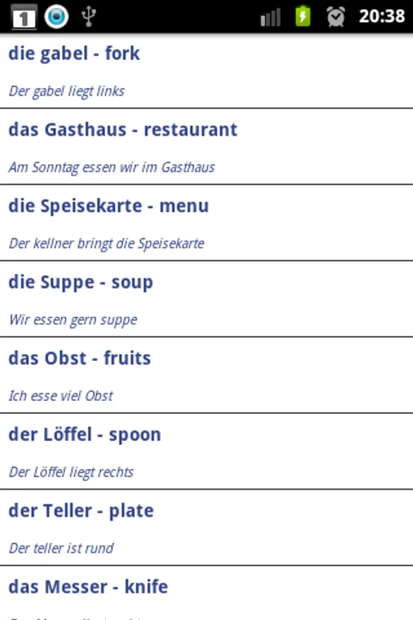 This German language learning widget can be great for those who learn German at school, language course or those learning by themselves. Every word has its english translation, and German phrase which will help You to learn.