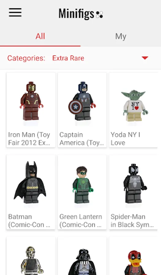 Minifigs is must have application for all LEGO® Minifigures™ collectors and fans. You can browse largest LEGO® Minifigures™ online collection and create your own Minifigures™ catalogue. Application shows value for each Minifigure™ and calculates total value of your collection.