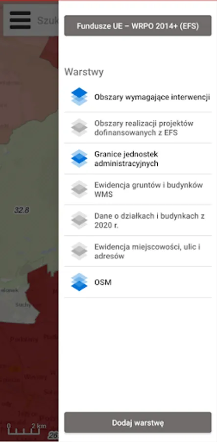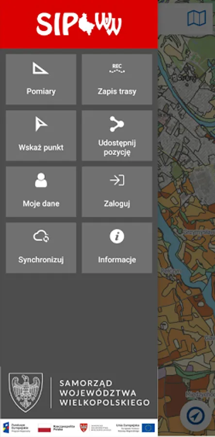 The mobile application of SIPWW of the Wielkopolskie Voivodeship enables access to spatial data collection services, searching for registration parcels, adding services, selecting map compositions, searching for geographical objects.