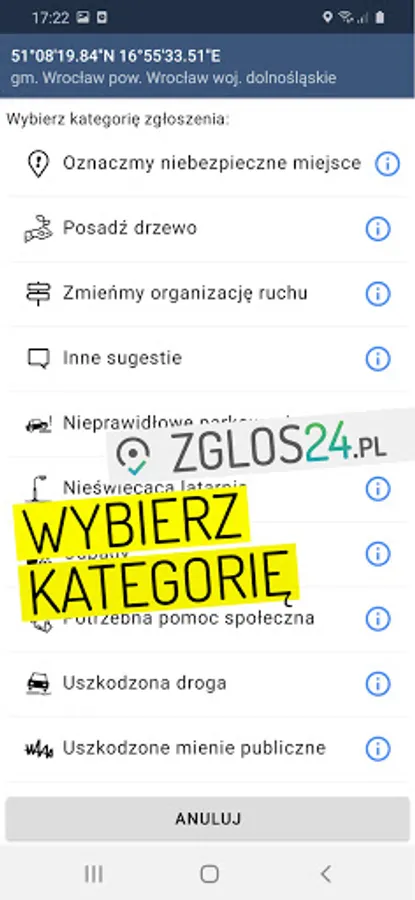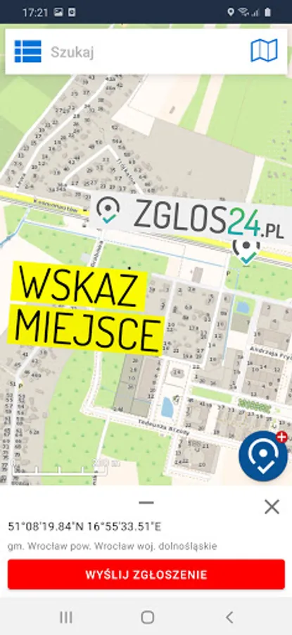 1. You run the application, which will automatically locate your position on the map. Applications are possible in areas where the commune has launched the service (if it has not been done yet, go to zglos24.pl/addaj).