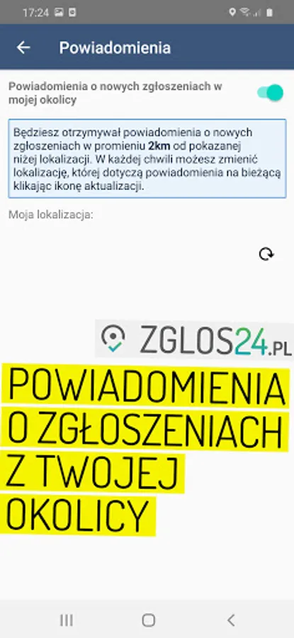 The ZGLOS24.PL system operates in the municipalities that have implemented the service. If you want it to be possible in your area to send notifications using the application, go to zglos24.pl/add and inform the commune about ZGLOS24.PL!