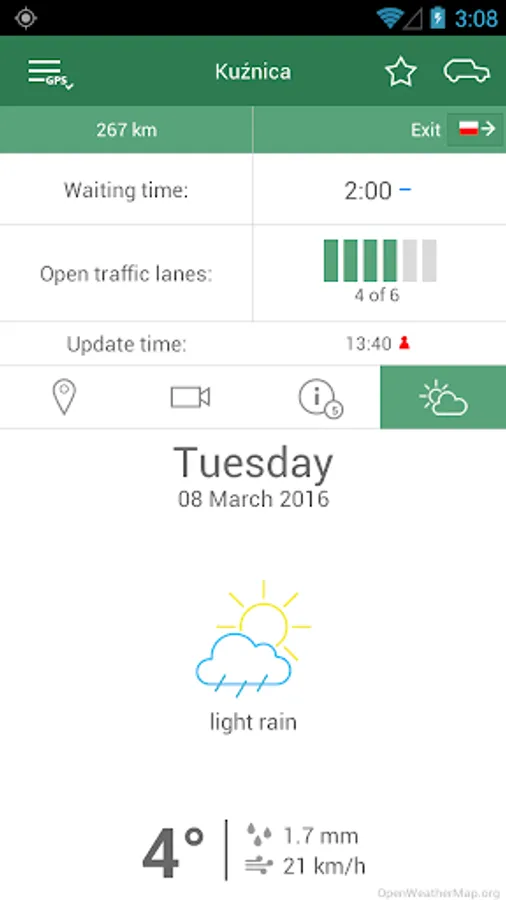 The mobile application will allow travelers using mobile devices access to information on current situation at Polish border crossings in such areas as queue length, average waiting time for customs clearance, waiting time forecasts and changes in the coming hours, messages related to border crossings (adapted to the current GPS position) and other relevant information eg. access to publicly available images from surveillance cameras).
