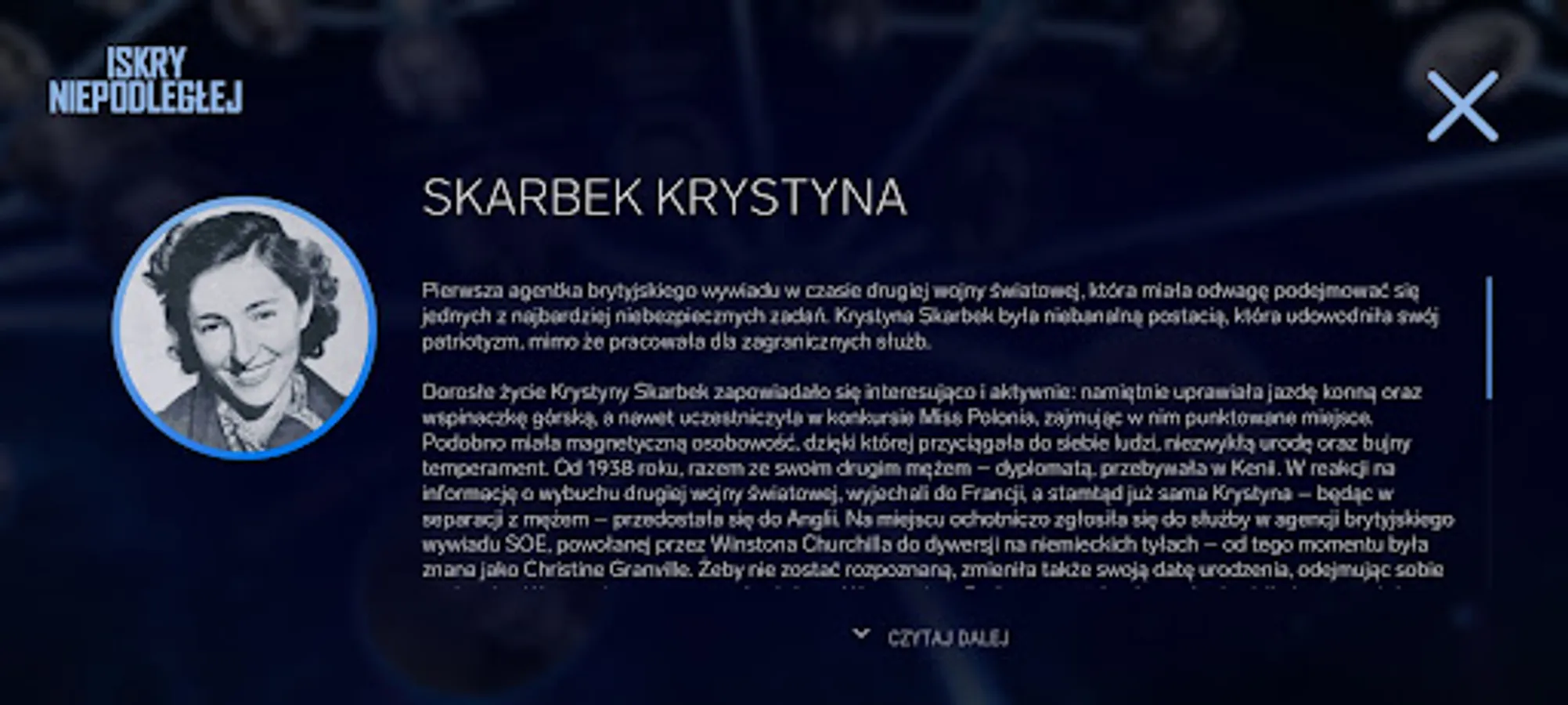 The application is part of the ISKRA INDEPENDENT project. The mobile spectacle travels around Poland in a special exhibition trailer. Inside, a digital narrator talks about the groundbreaking achievements of Poles in various areas of life that make up our everyday life: technology, medicine, science, social work, culture, exploration of the world and space, sport. More information about the project is available at https://www.iskryniepodleglej.pl
