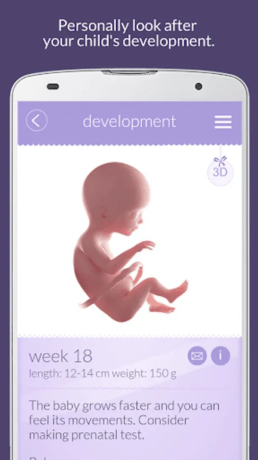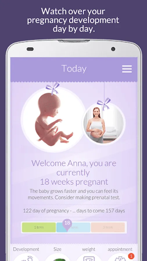 With this mode, you can stay calm during your pregnancy week by week. The visit planner will control the dates of tests and medical appointments, and a shopping list will help you gather all the things you will need to pack for the hospital. The development and size function will let you see the size and the following stages of foetus development.