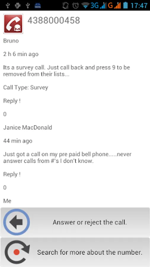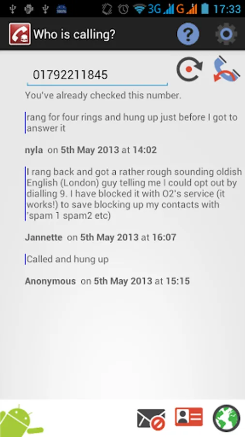The application allows you to check the identity of an unknown number when it is ringing or later after choose from the recent calls list.