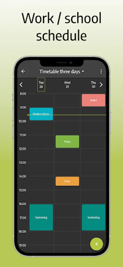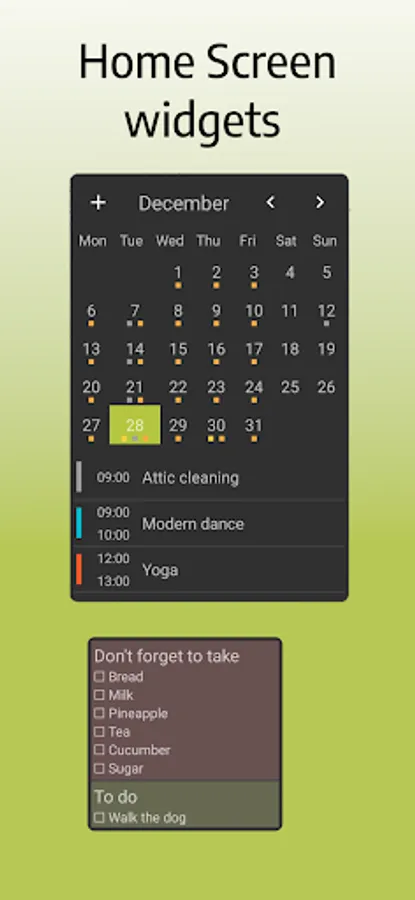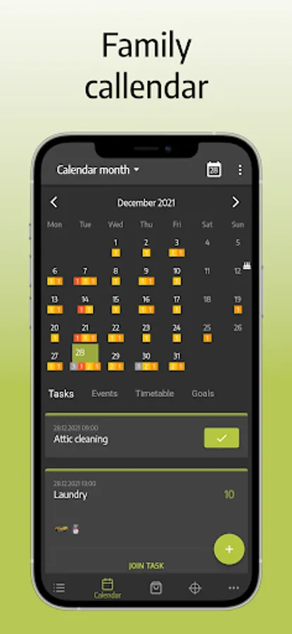 • A clear calendar with colored markings for added tasks, events and a schedule available for the whole family.