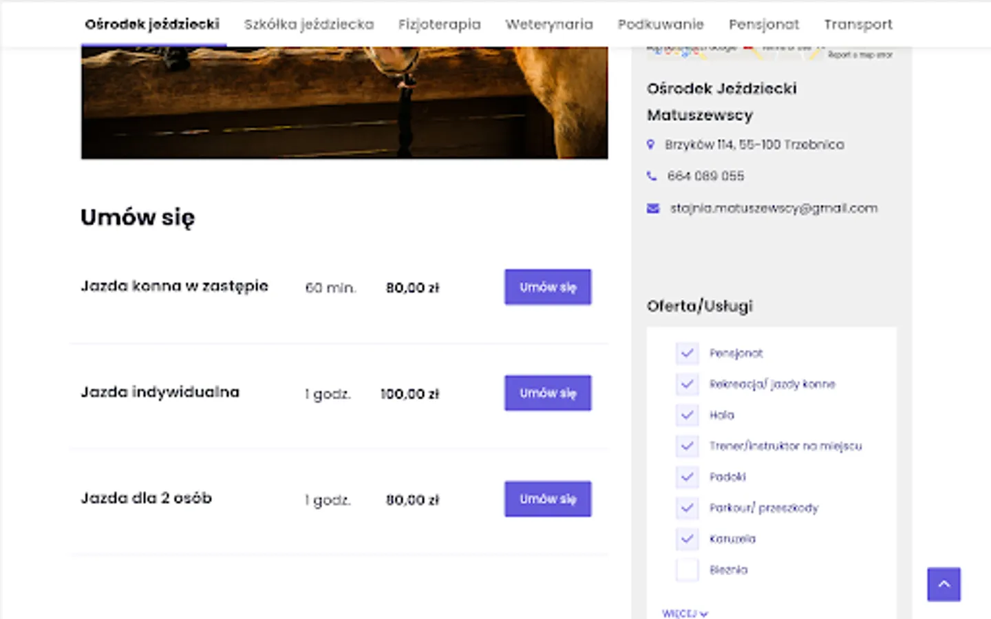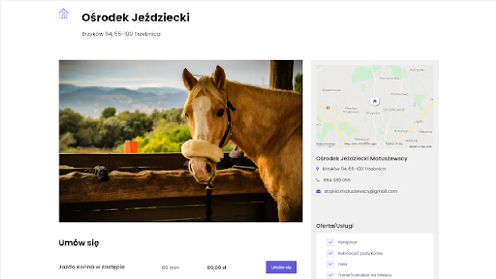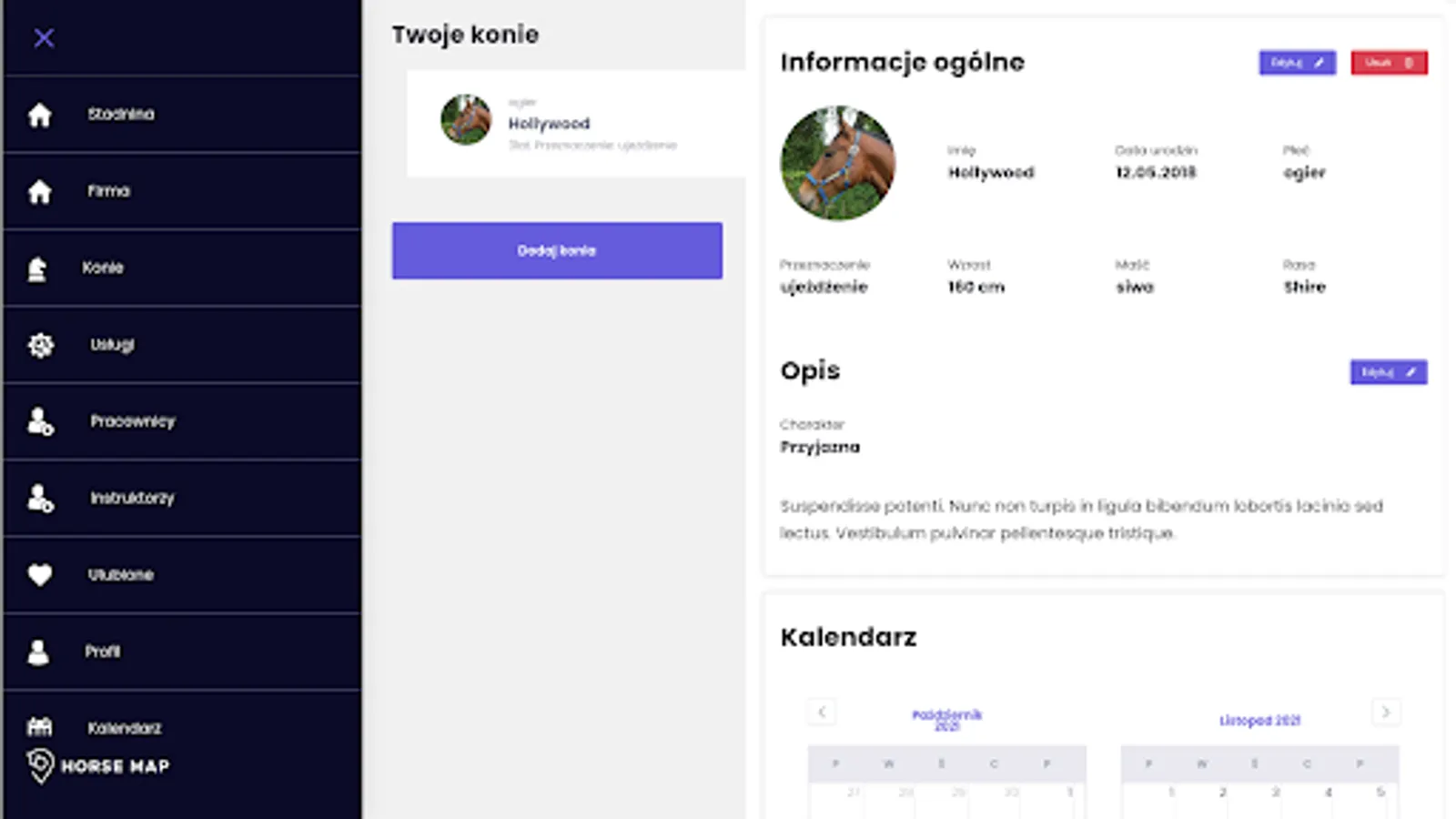 HorseMap is an application that connects all horse lovers in one place. The basic function of the application is to improve the process of booking horse rides and other equestrian services. The application is dedicated to people who want to book a horse riding lesson, horse owners, riders, studs and all service providers in this industry. The biggest advantage of the system is the e-calendar and automatic notifications that remind you of upcoming events. HorseMap is not only about booking visits, but also managing the horse database. The application allows you to add basic horse data and information about the treatments that were performed on it.