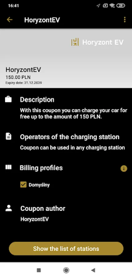 Thanks to Horyzont EV app you will charge your electric vehicle. Install the app, open an account, find a charging point and charge your electric vehicle. Pay by credit card or reduce fees through coupons. Control your business expenses thanks to billing profiles.