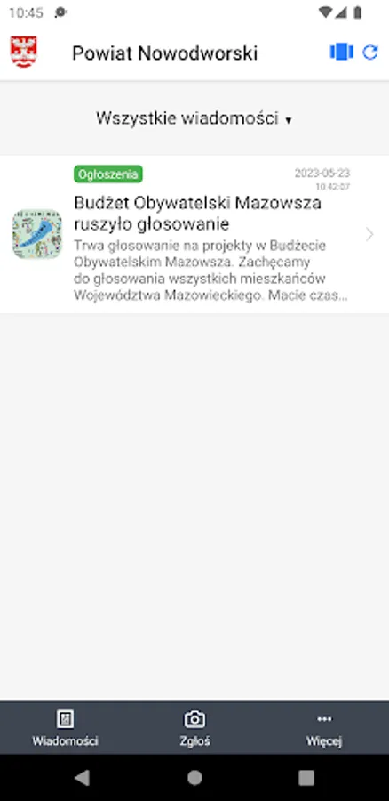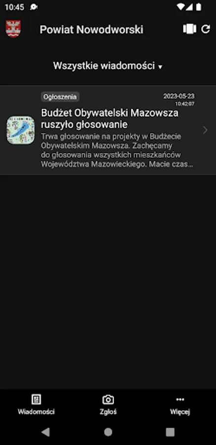 The mobile application allows you to receive any messages or information about threats sent by the managing entity. It can also be a valuable source of information about the services provided by the Nowodworski District.