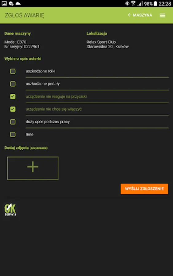 The application was developed by IMG Fitness with the utmost attention to detail. The application is suitable for every fitness club, regardless of size. OK Service will help you to easily control all the devices in your club. With this application an easy way to report a fault. It would be enough to: