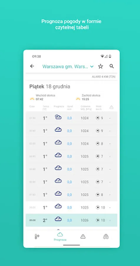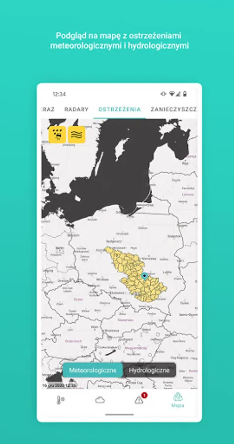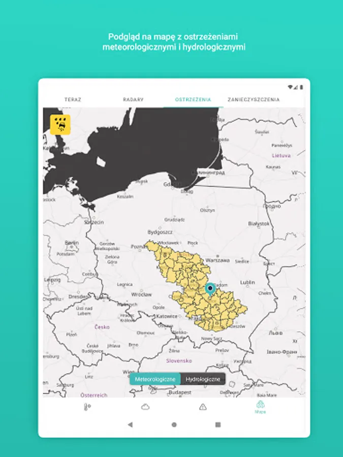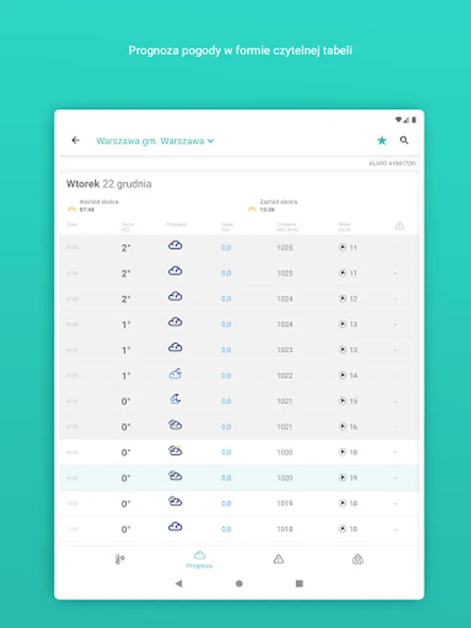The application provides two types of notifications: Forecast - containing an abbreviated forecast for the day: minimum temperature, maximum temperature, precipitation, wind speed and pressure. Warnings - the application sends a message when a warning is issued by IMWM-PIB. Details of the Warnings are available in the Warnings tab.