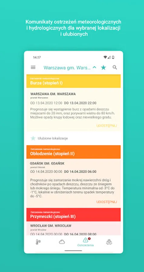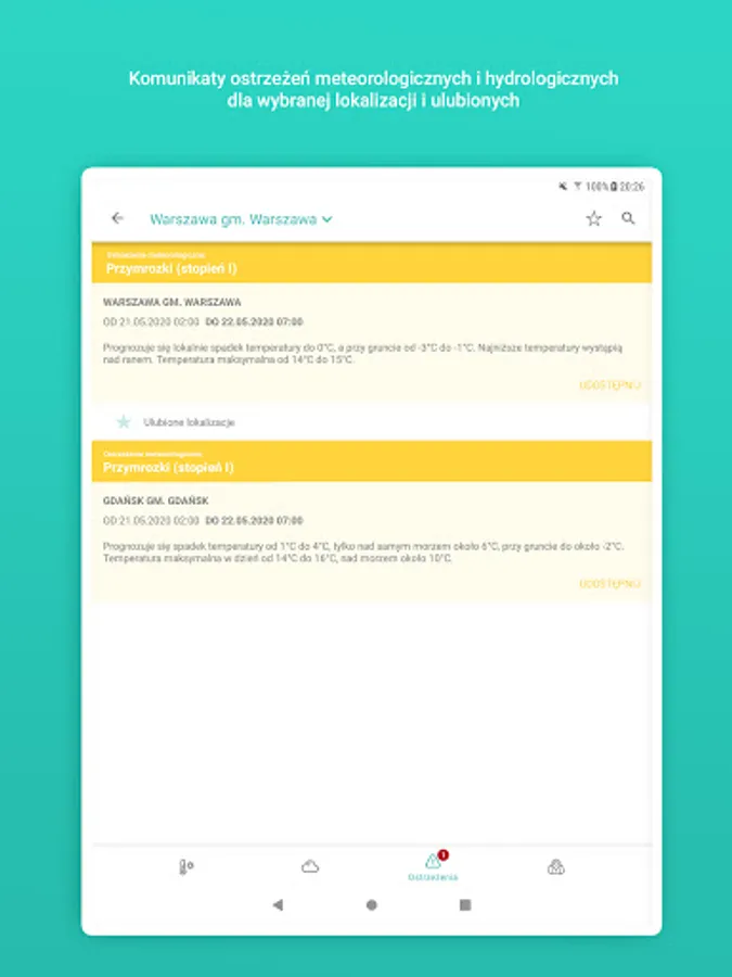 Here you will find meteorological and hydrological warnings of the IMWM-PIB issued for the currently selected and Favorite locations.