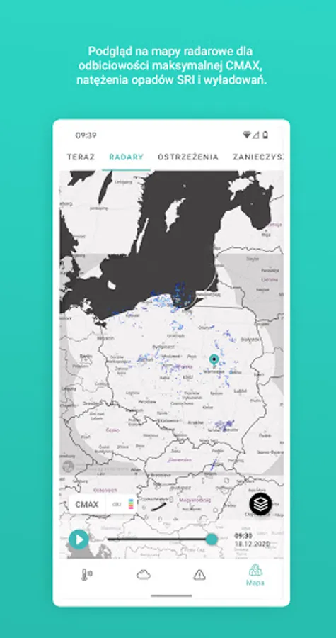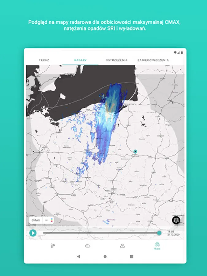 In the Radars tab, you will find a preview recording the intensity of precipitation in Poland. The preview allows you to trace the weather situation 7 hours back.