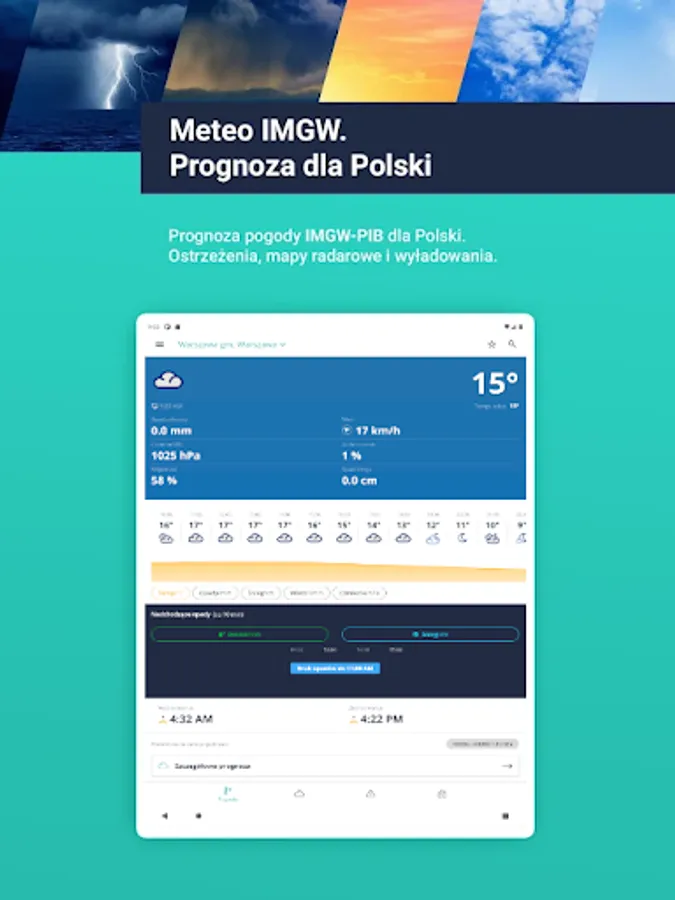 Application with the IMWM-PIB weather forecast dedicated to Poland. It is a reliable source of current and forecast weather. Only in it, the integration of all available weather models, warnings, preview of radar and lightning maps. The application also allows you to set up notifications with forecast and warnings. Clear, modern, easy to navigate. Comprehensive weather information from IMWM-PIB - scientifically confirmed.
