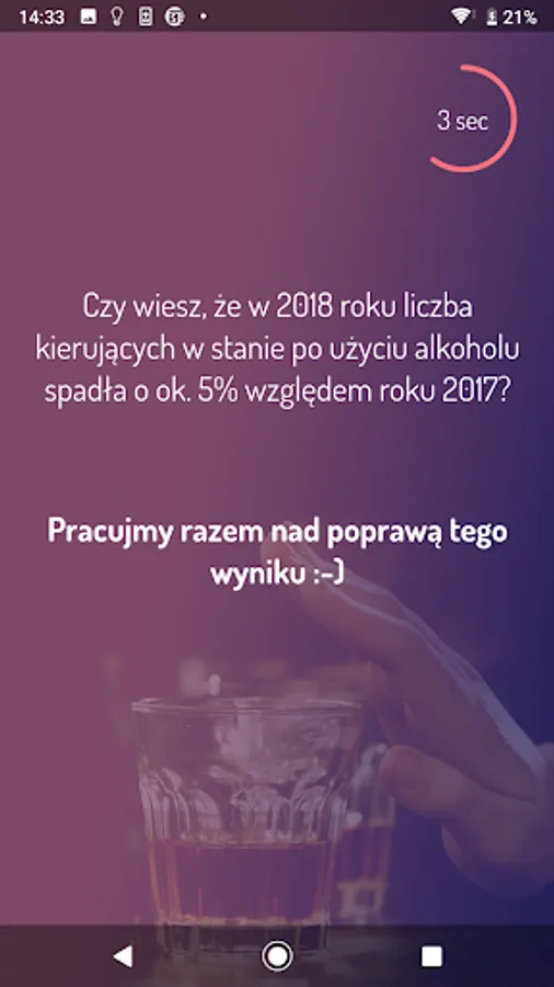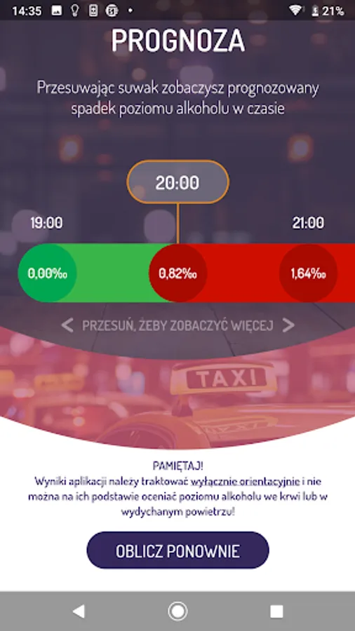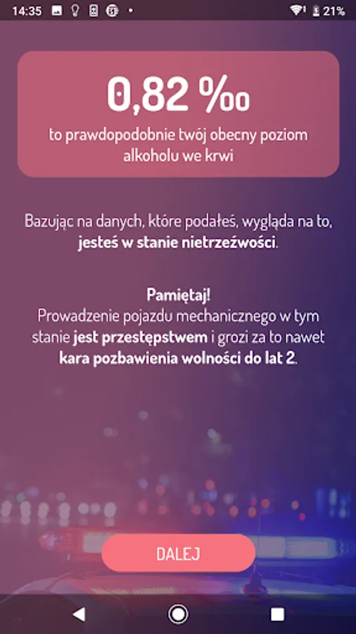All kinds of applications - "breathalyzers" available on the Internet, just like Alkotest, only provide an approximate result. They do not take into account many individual factors affecting the metabolism of the human body. The result of the breathalyser used, e.g. by the police, always overrides the on-line breathalyser. If you have any doubts about whether you should get behind the wheel, do not do it!