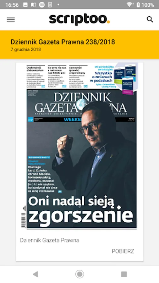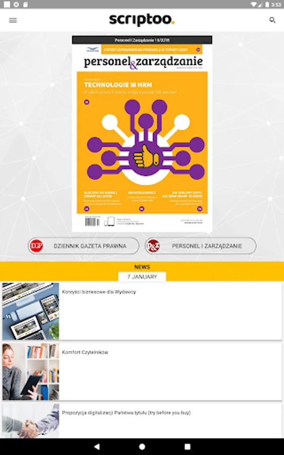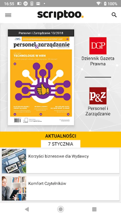 The Scriptoo mobile application provides examples of magazine numbers of the leading Infor PL publishing house on the Polish market, which is the leader in the distribution of electronic editions. We offer you access to two editions of Dziennik Gazeta Prawna and monthly issue of Personel i Zarządzanie.