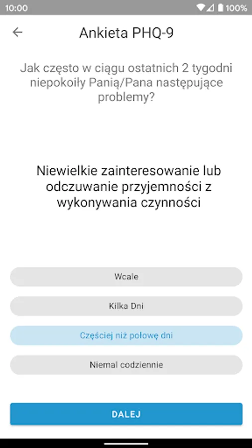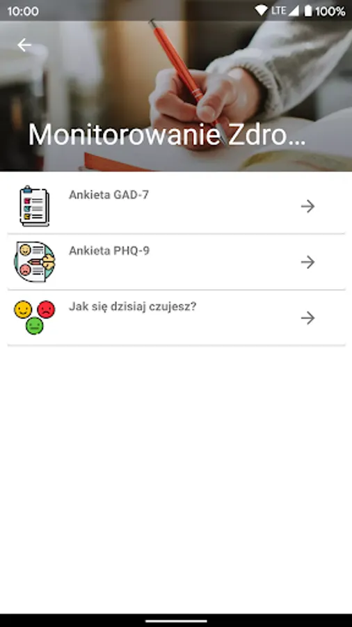 The application has a relaxation module containing mandalas for coloring, relaxation workouts and relaxing music. The application also contains modules helpful in self-monitoring of health, i.e. drug reminders, validated questionnaires for periodic assessment of depression and anxiety symptoms. An important element of the application is also the possibility of completing the survey on a daily basis, in which you can assess your well-being in various aspects (mood, activity level, stress level, sleep and general feelings of health). On the basis of the data entered by you, feedback is generated and a chart of mood changes is created, to which you have permanent access. The application also indicates contact details (nationwide telephones and stationary outlets in Warsaw), where you can get specialist help.