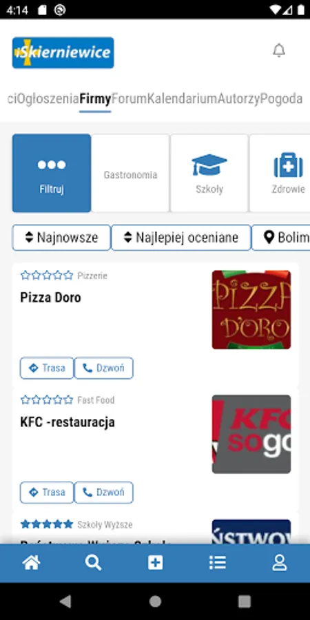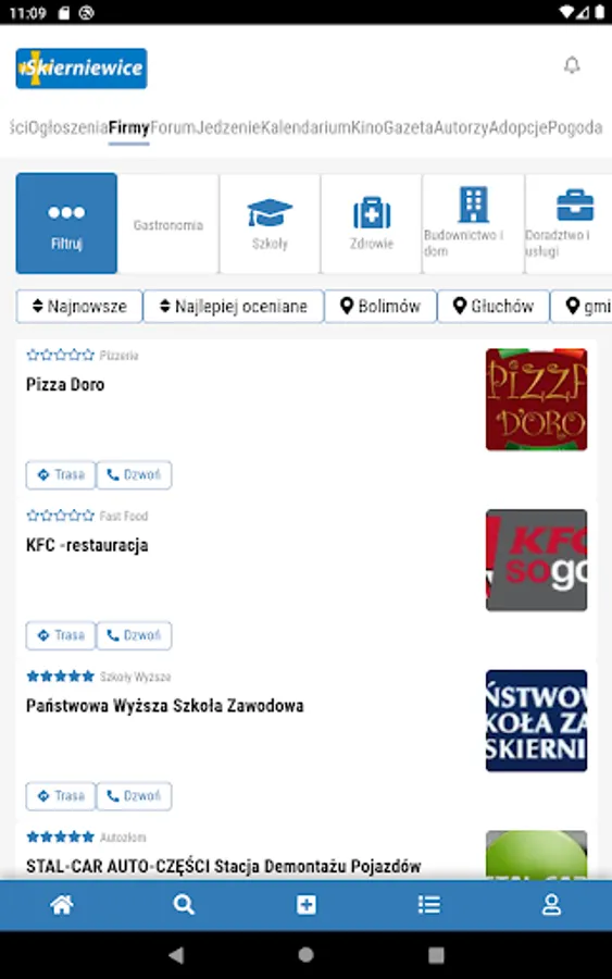 In the application you will find a rich database of companies and institutions from the area of Skierniewice. Doctors, health services, telecommunications, catering, financial services, schools, shops - all in one place. If you are looking for an optician, gynecologist or dentist - you've come to the right place. Our database also includes numerous restaurants, shops, telecommunications companies and many more.