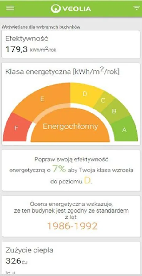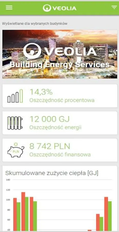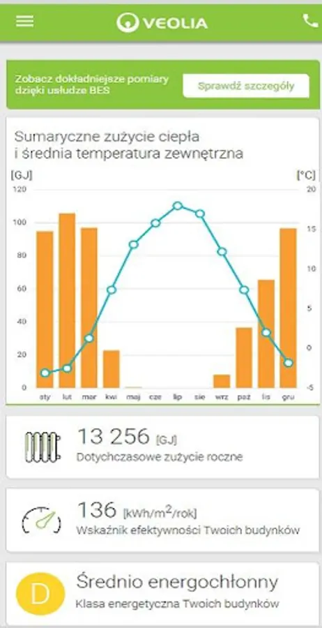 The Veolia mobile application is comfort and economy. It allows you to control the costs of heat consumption on an ongoing basis. Thanks to it, you gain instant access to information about buildings. You can check both the weekly heat consumption, the energy efficiency index of buildings and their energy class. The Veolia mobile application is integrated with the Veolia BES (Building Energy Services) system. It allows you to reduce heat consumption by up to 15% while ensuring thermal comfort for the residents of the building. As part of the connection with the Veolia BES system, the application not only informs about the outside temperature and ambient conditions, but also about the temperature inside the facility. Thanks to this, constant supervision over the comfort of residents of a given building is ensured. We also obtain data on energy and financial savings obtained through the use of Veolia solutions. Thanks to this, we can see "black and white" what amount we saved. An important element of the system is also the ability to check the impact of ambient temperature on current heat consumption.
