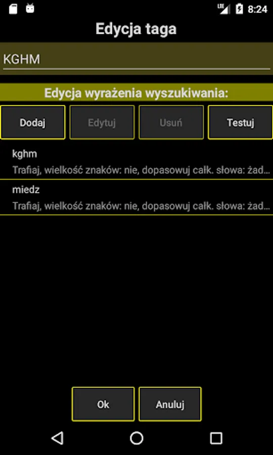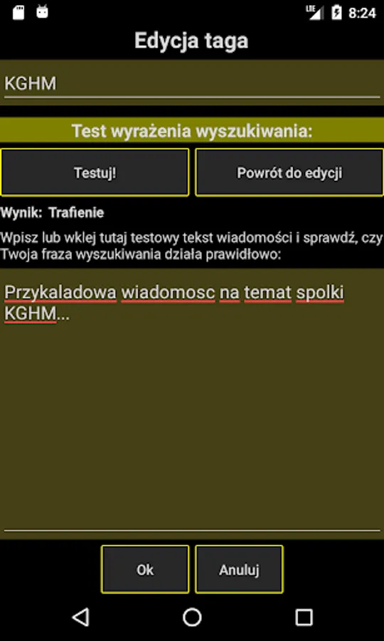 It is recommended to use the test function of the created tag - after defining hit phrases, you can check their operation on any text. Thanks to this, you will be sure that the GPW News application searches the media in the right way.