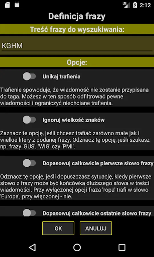 How does it work and what distinguishes GPW news from among many news applications? One fact: you independently define the way of analyzing the message content on the basis of which the system assesses whether it is a message from your interests or not. You do this by providing phrases (usually one word, sometimes more) which the system searches in the body of the message. With additional options, you can further specify how the system should determine whether a given phrase appears in the content - for example: