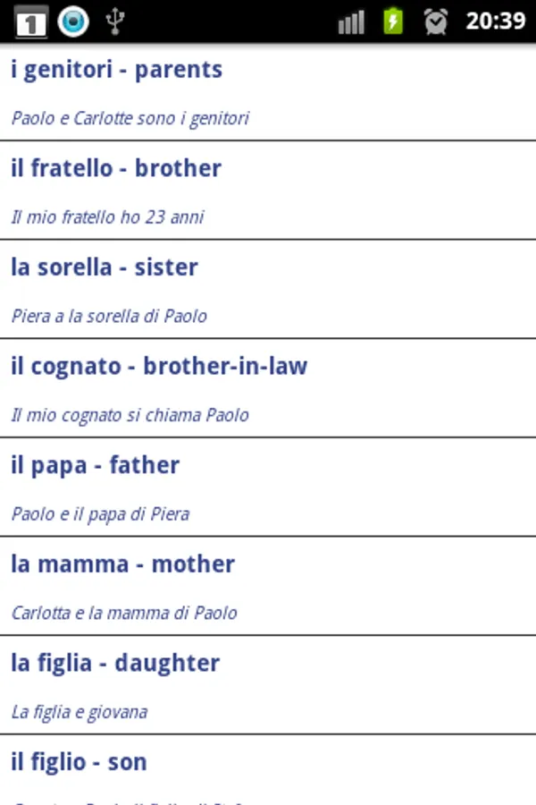 This Italian language learning widget can be great for those who learn Italian at school, language course or those learning by themselves. Every word has its english translation, and Italian phrase which will help You to learn.