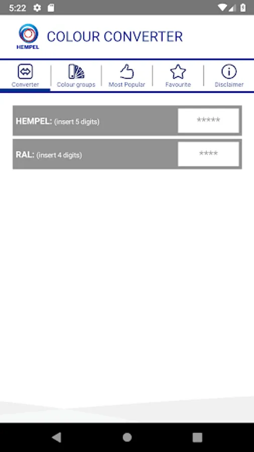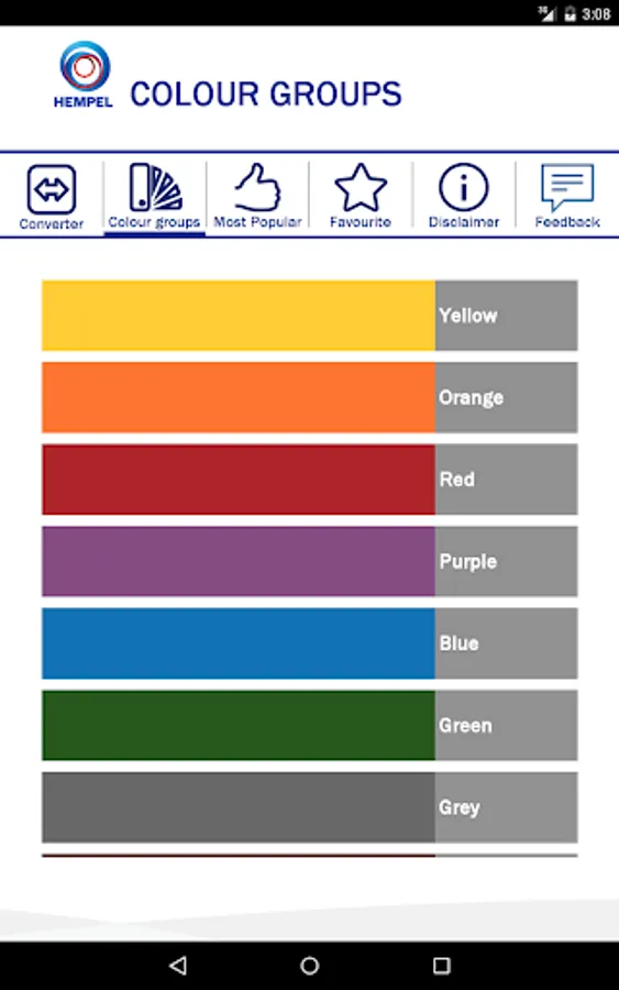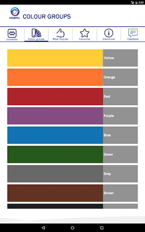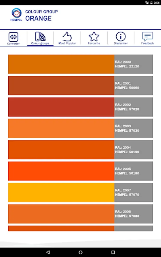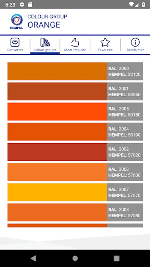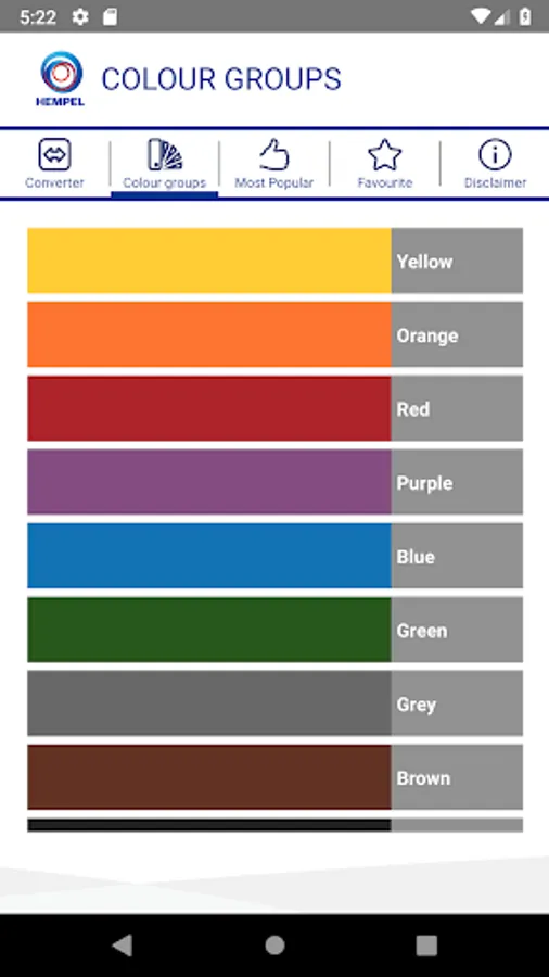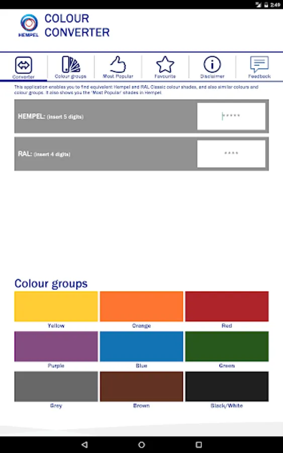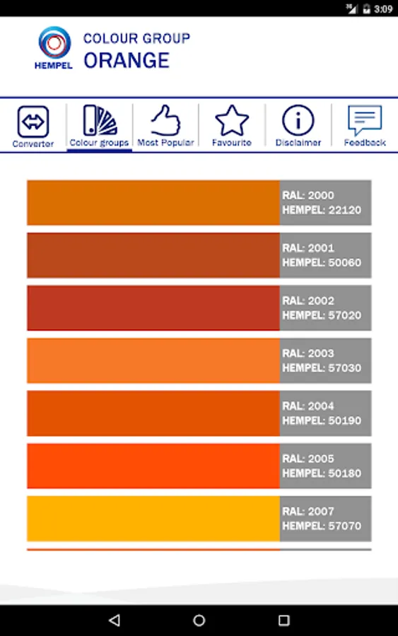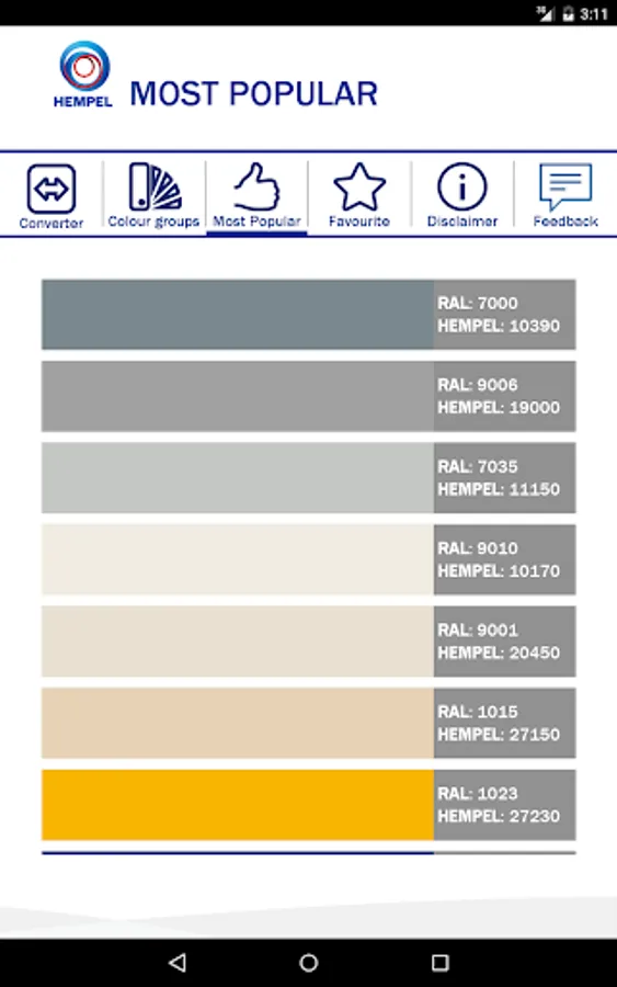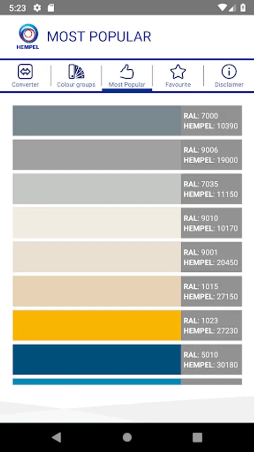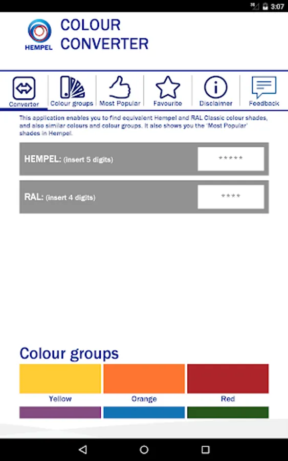 This application enables you to find equivalent Hempel and RAL Classic colour shades, and also similar colours and colour groups. It also shows you the ‘Most Popular’ shades in Hempel.