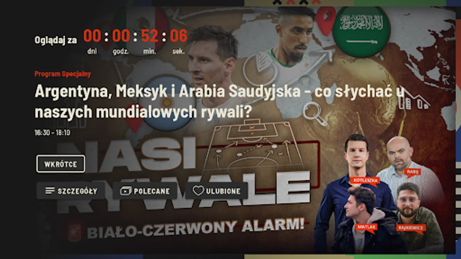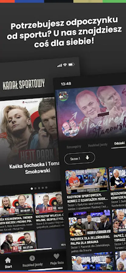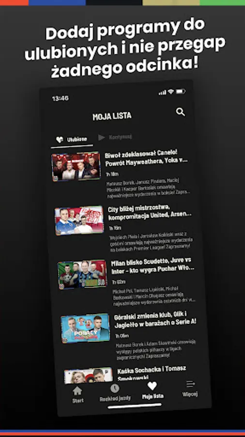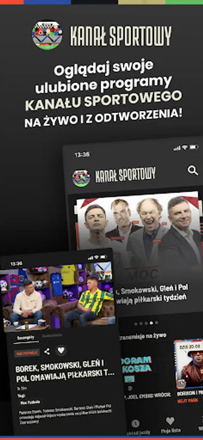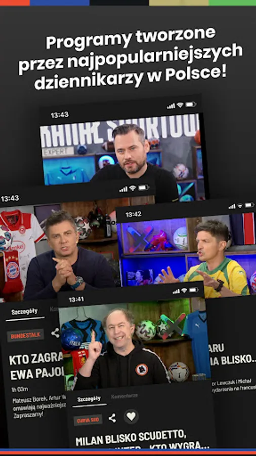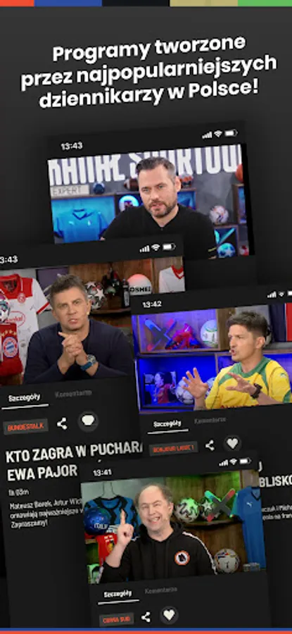Watch programs created by the greatest sports journalists in Poland, including: Mateusz Borek, Michał Pol, Tomasz Smokowski and Krzysztof Stanowski - all this and much more can be found in our application!