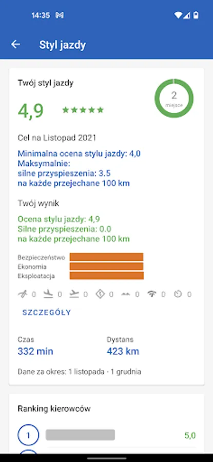 In the application you will find an assessment of the driving style with its components, driver rankings, gamification (competitions, rankings, indications of driving style elements that require improvement)
