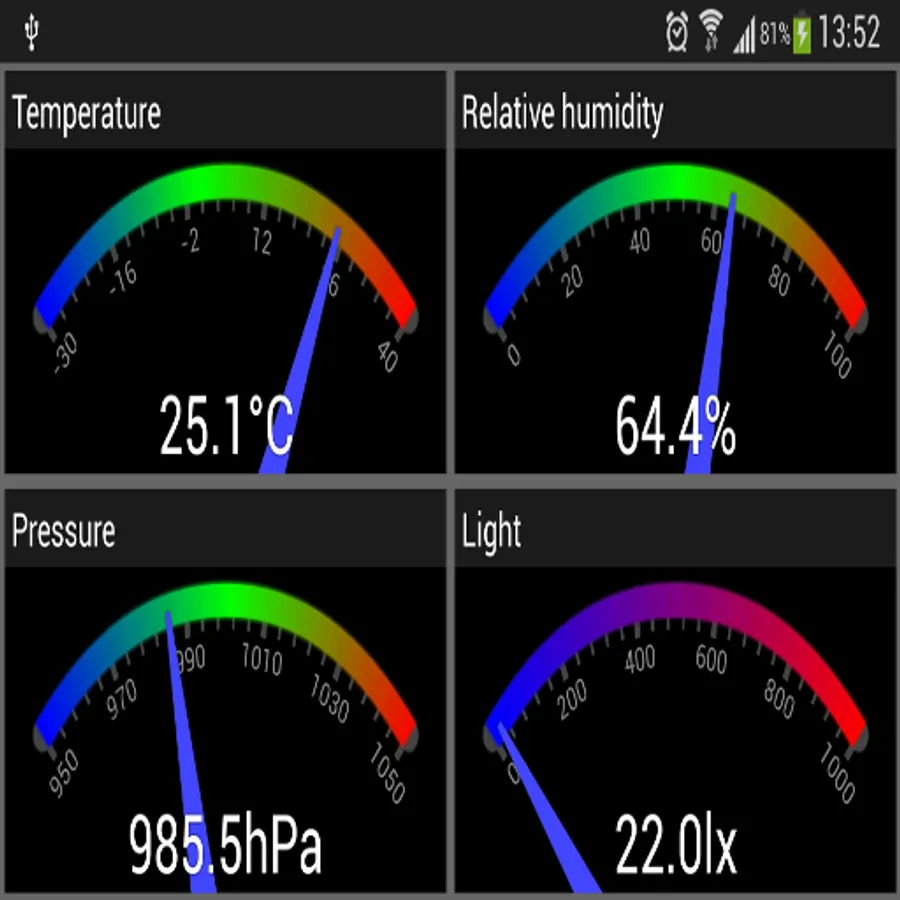 The application shows data from 4 sensors Samsung Galaxy S4:
