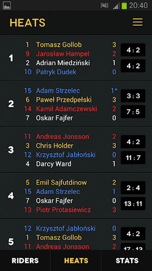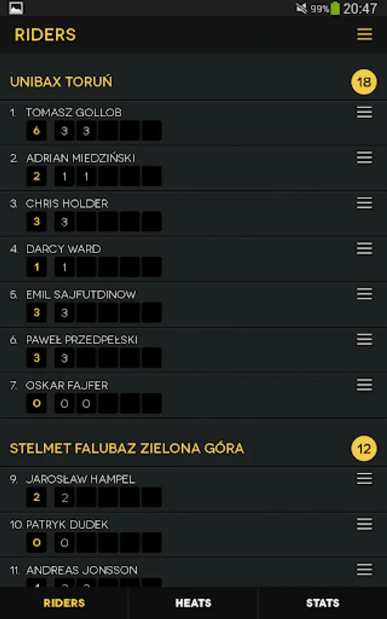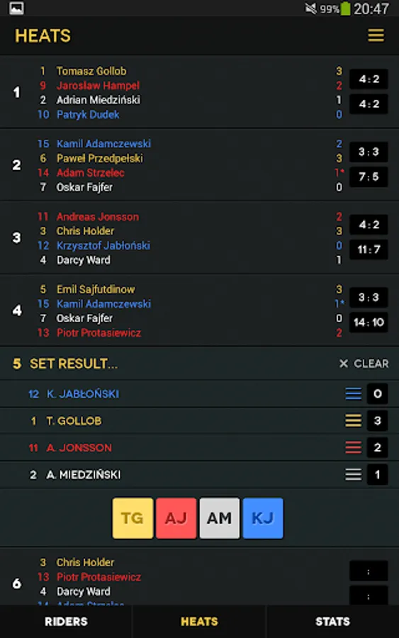 Speedway Programme is an application for speedway fans, who want to have access to speedway programme while watching speedway meeting. If you would like to see schedule of next heats, rider results and stats You need to install this application. Filling in speedway programme has never been so easy. It doesn't matter if You are at the stadium or just watch meeting in tv. From now You don't need the printed programme. Just open an application, choose meeting type and set squads. Speedway programme will be generated and You will be able to fill it in readily.