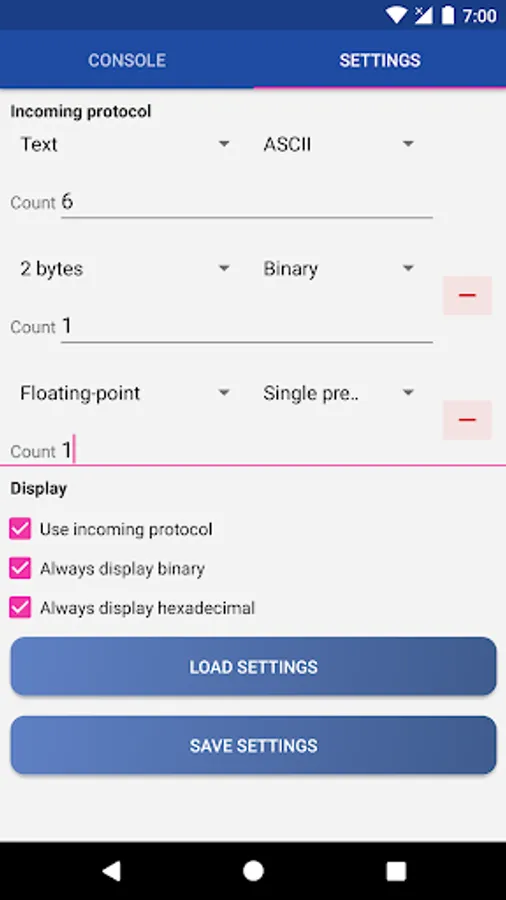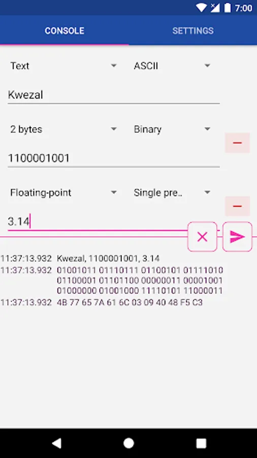 Available data types in terminal include: plain text (in ASCII or UTF-8 encoding), floating-point numbers (of single or double precision) binary coded according to the IEEE 754 standard, and also integers with any (from 1 to 8) number of bytes that can be entered into the console as a decimal, binary or hexadecimal number.