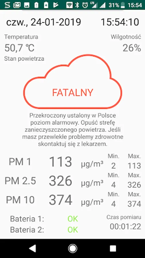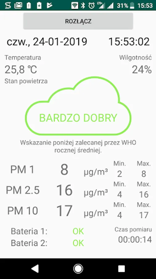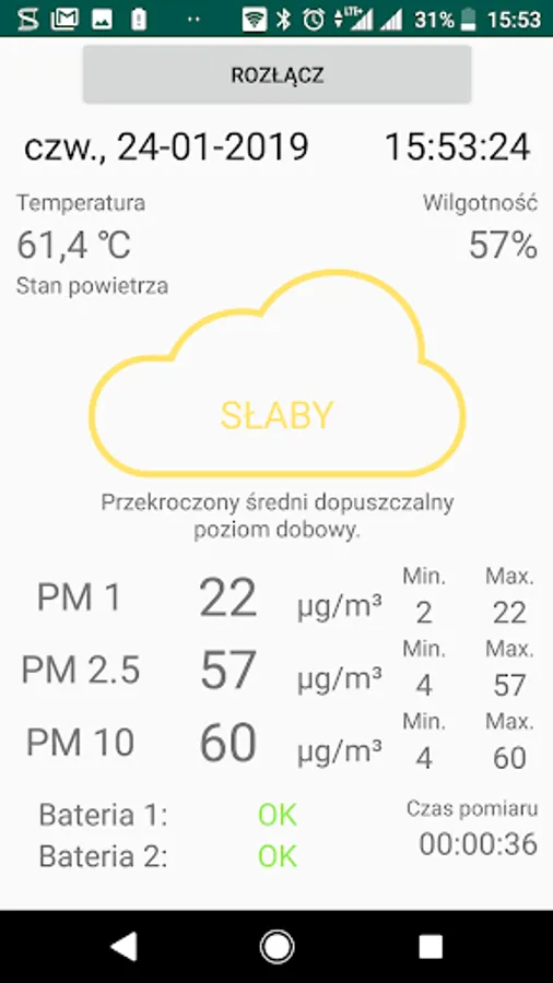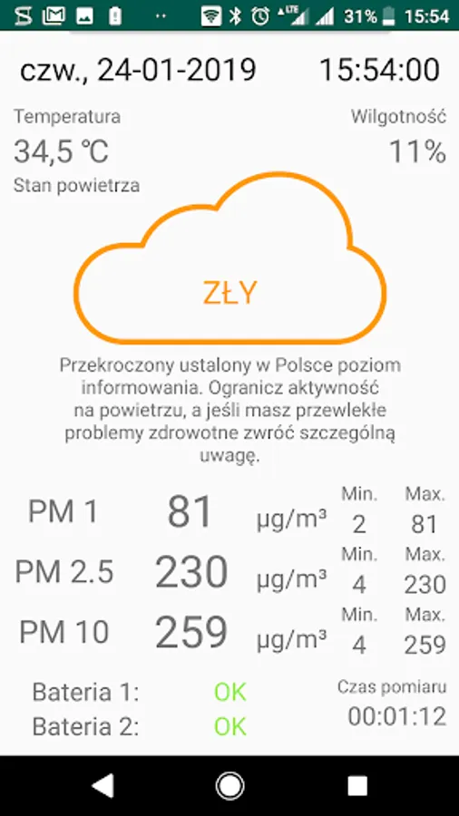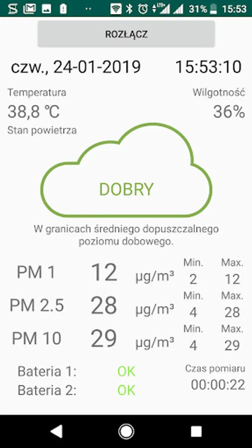The application for connection with BBAir and BBAir Lite air sensors allows monitoring the levels of suspended PM10, PM2.5 and PM1 as well as humidity and temperature.