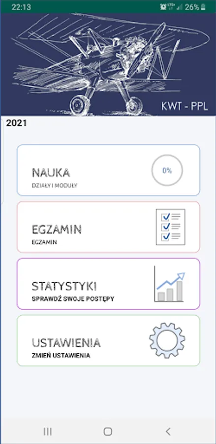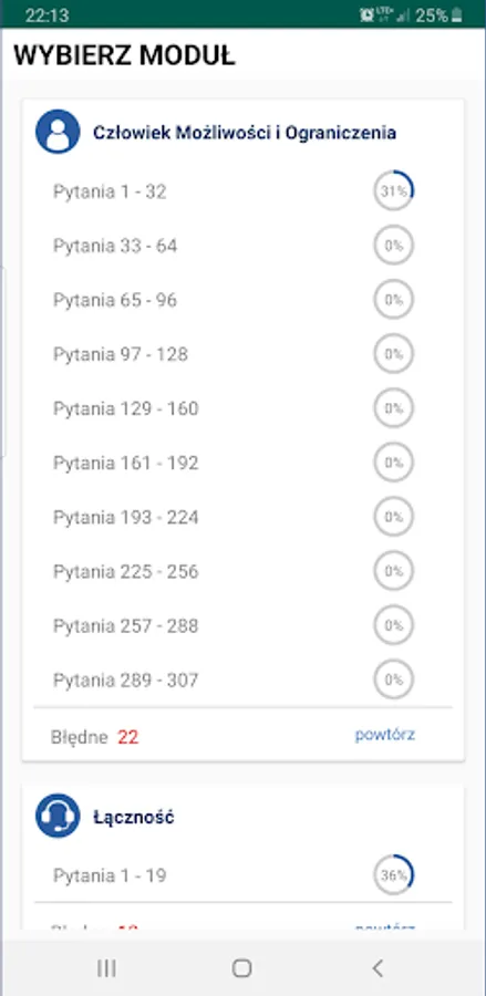 The "Learning" mode consists of several modules from the fields required for the PPL (A) license. For your convenience, the questions have been divided into groups (each group consists of 32 questions), which will allow you to gradually gain knowledge and better control your progress.