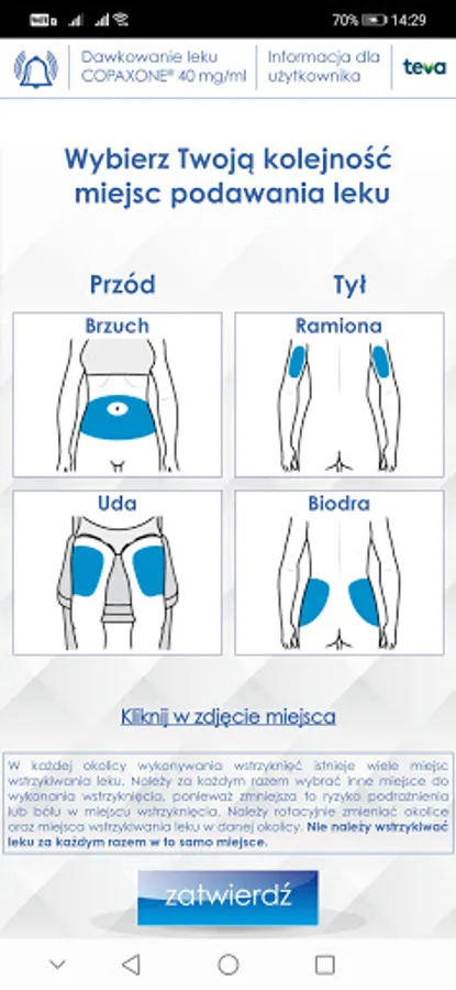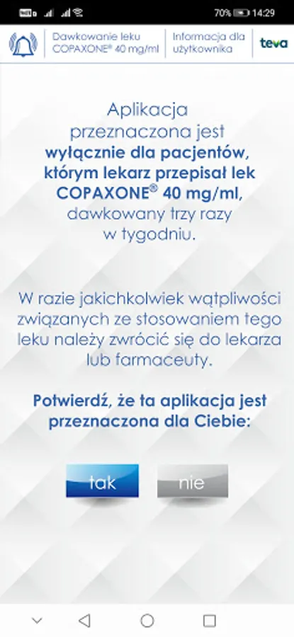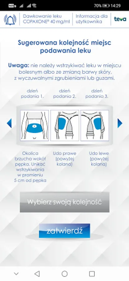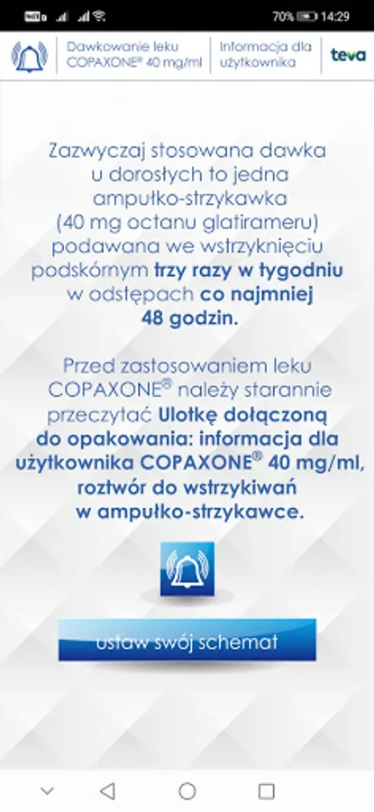 The application is designed for patients who have been prescribed the drug Copaxone 40 mg / ml dosed three times a week.