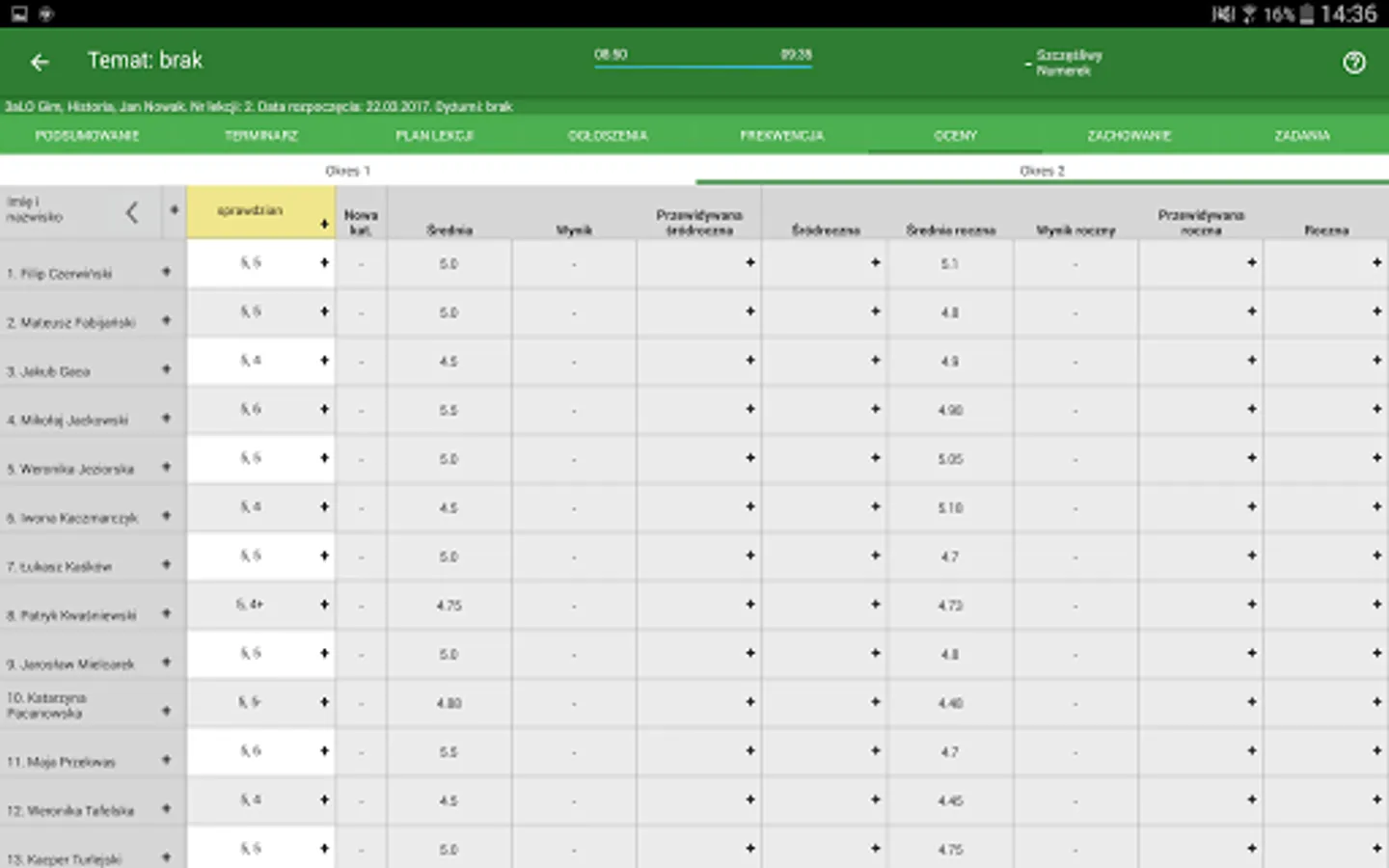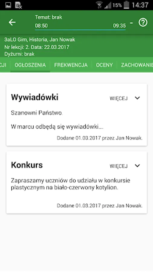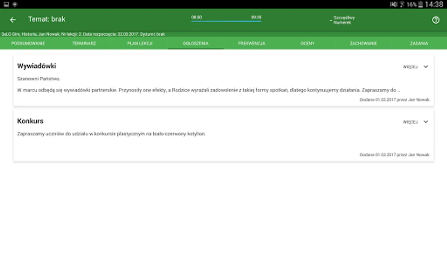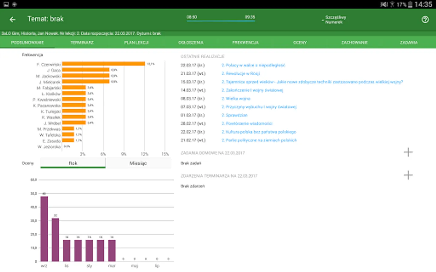 The application presents data that was entered into the database by the school. The frequency, scope of data and the timeliness of their entry is the same as the web version of the system and depends only on the school and its employees.