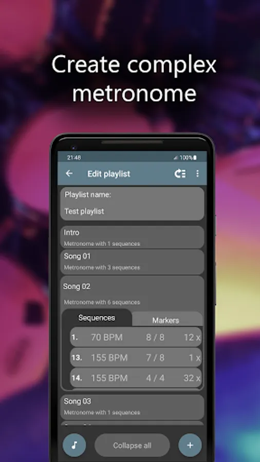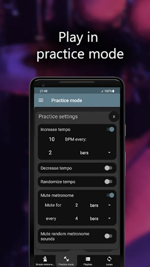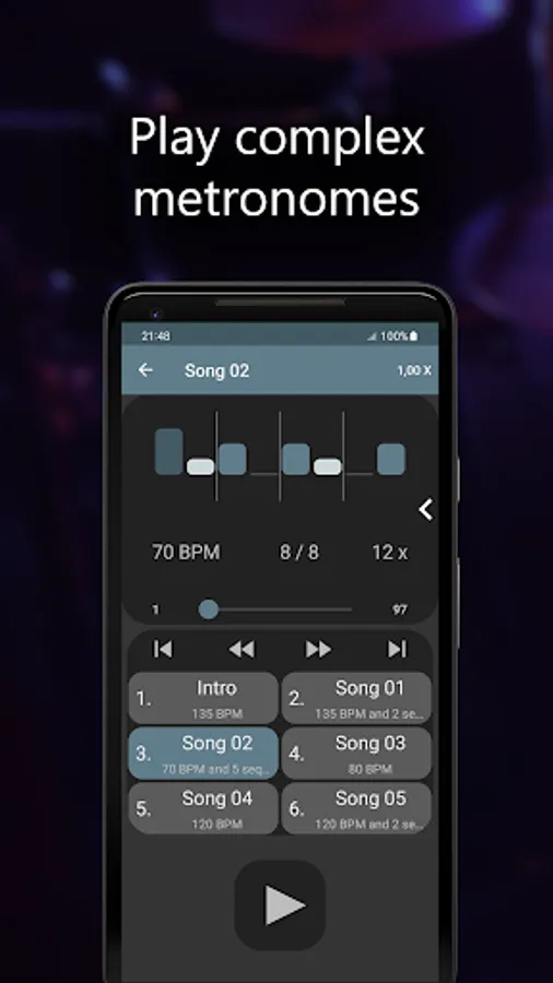 Become a better musician with Camtronome! The app features various and advanced tools mixed with a user-friendly interface. Also, the meter and note value can change automatically during your practice session. From now, complex beats will always be within your reach. Moreover, you may create playlists, thanks to which all your unique metronomes will be well-organized. Then, you can store them in the Cloud. Do you want to practice 120 bpm tempo, ¾ meter, or perform some drumming exercises? Our pro metronome app will meet all your expectations. Also, it's suitable for any music genre (from 12 bar blues to power metal), and there are 47 available sound samples of clicks.