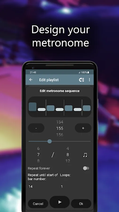 Download and install the Camtronome app on your mobile to perform solo or group music practice every time you want! You can loop preferred settings to keep a steady tempo during your rehearsal. This metronome app was designed for musicians who need a complex, programmable digital metronome that can easily change bpm. It's suitable for artists who read sheet music and those who have just started their musical journey. If you're a professional drummer, save all your unique playlists, get on stage and play the whole concert without a single mistake - the click will guide you through each piece! The extensive training mode will help you develop excellent rhythm skills and a steady tempo wherever you are. Camtronome (pro metronome with camera) is always at your fingertips.