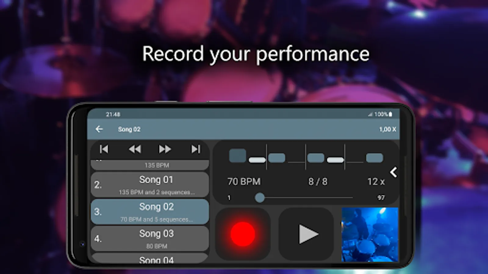 Do you want to master your rhythm skills? If so, Camtronome (a professional metronome with a camera) is a smart solution for you. Train your timing, precision, accuracy, and enjoy the multitude of handy settings. Our metronome app also features a video recording function, thanks to which you will monitor your progress. Program your own "beats per minute" with a straightforward "Tap Tempo" button! You will find vivid visual beat indicators within the app - change the pitch of the sound to make the click audible over your instrument. It's the best training tool for musicians playing drums, but it's also suitable for guitar, piano, ukulele, violin, hang drum, bass, or voice practice. This innovative and interactive pro metronome is ideal for keeping a steady tempo during rehearsals, recording sessions, and live concerts.