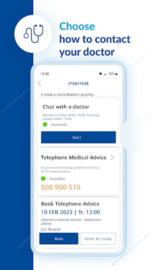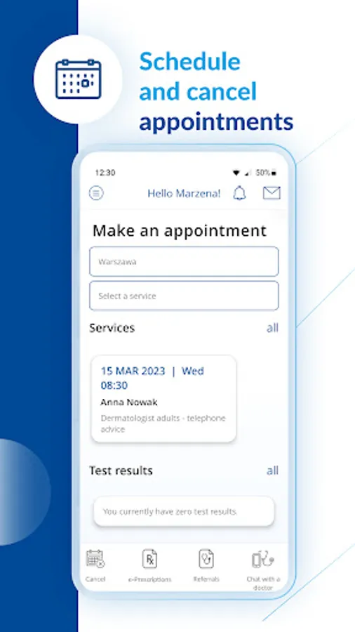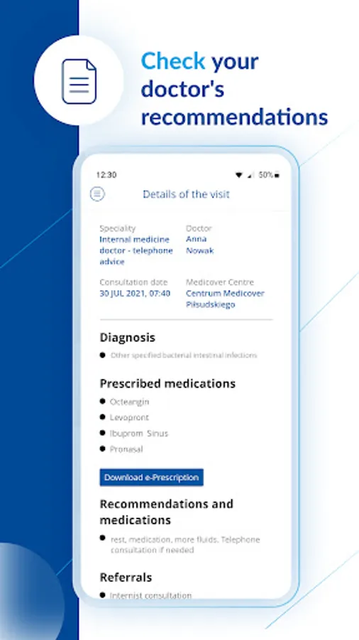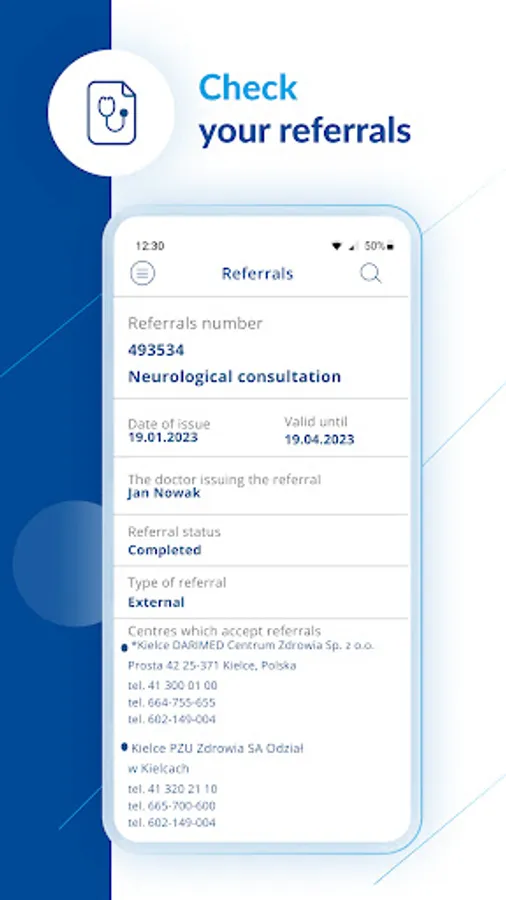 A transparent interface and intuitive navigation allow comfortable ordering of prescriptions to chronic medications, checking examination results, contacting the doctor after the appointment, analysing referrals or arranging an appointment with a medical specialist.